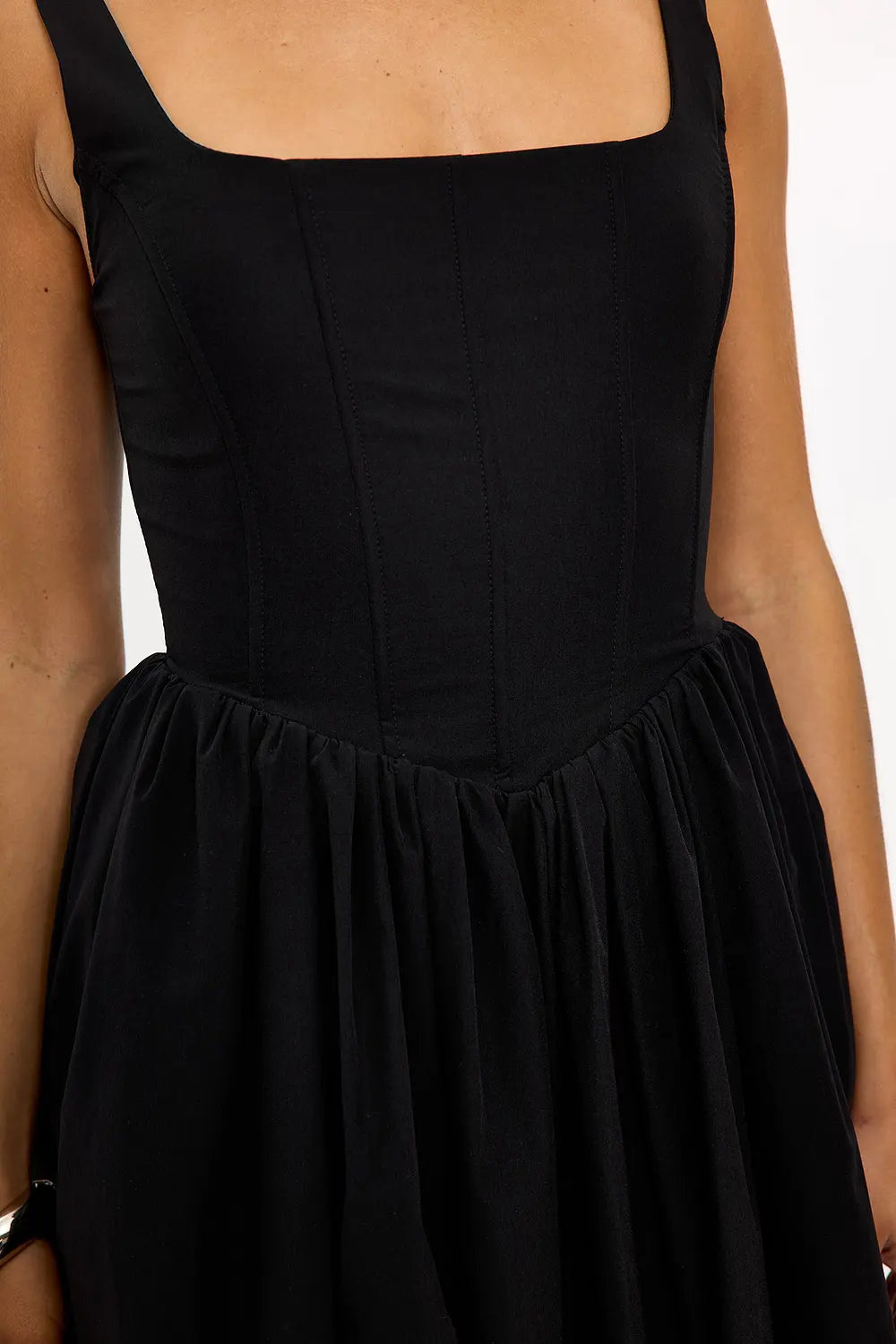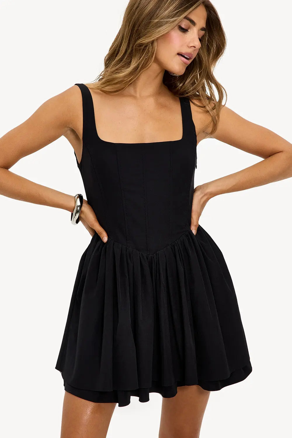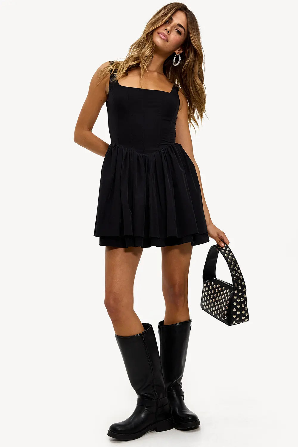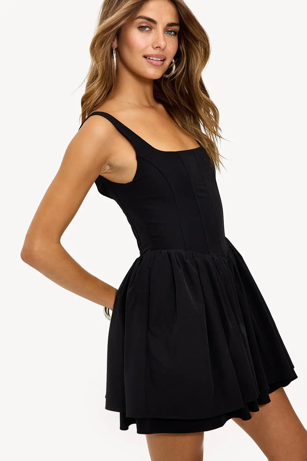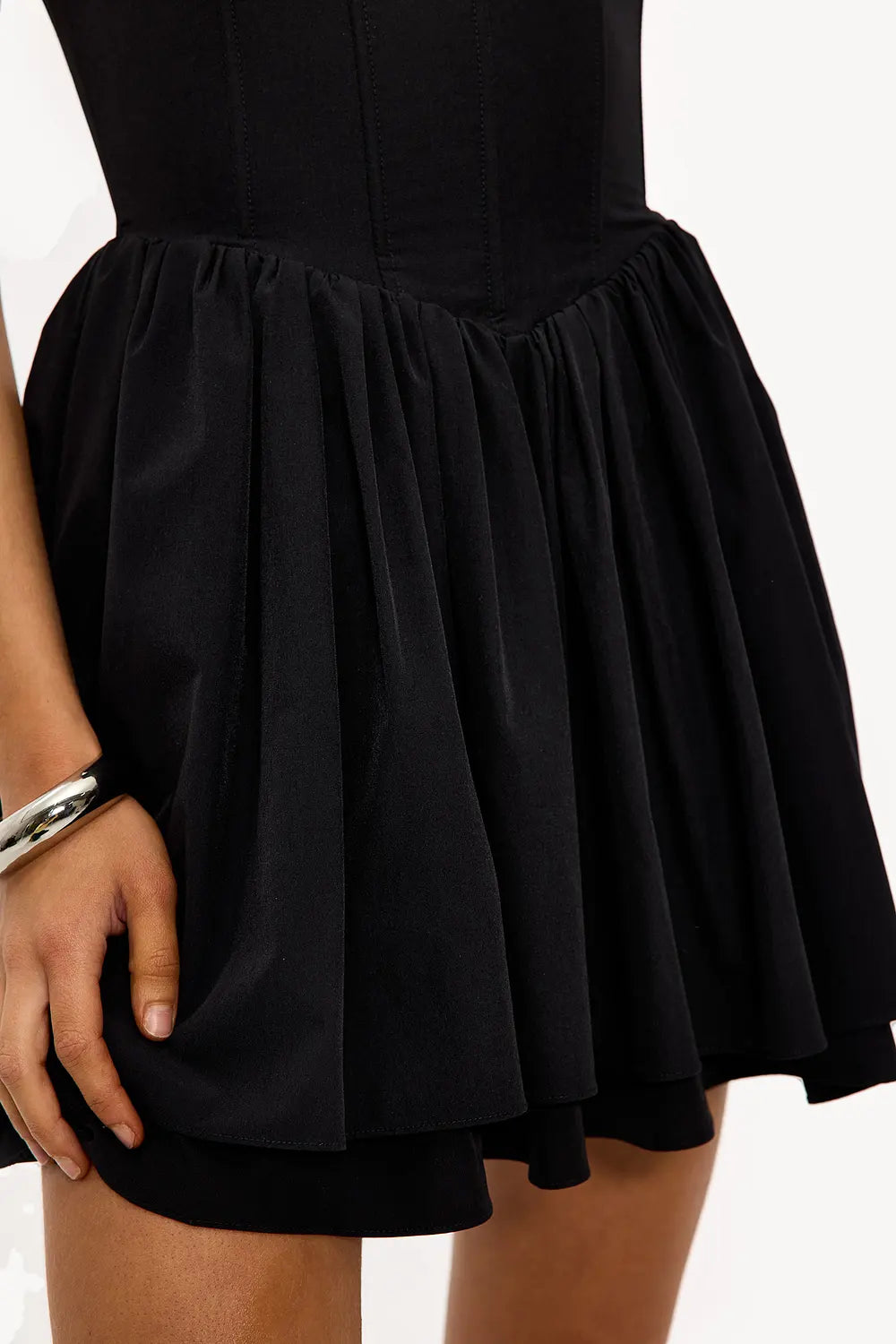 Deze zwarte mini dress heeft een statement corset-style top met subtiele verticale naden. De A-line rok met luxe plooien creëert een classy ballerina-inspired look. De fitted bovenkant met square neckline en brede schouderbanden zorgt voor een elegante shape.